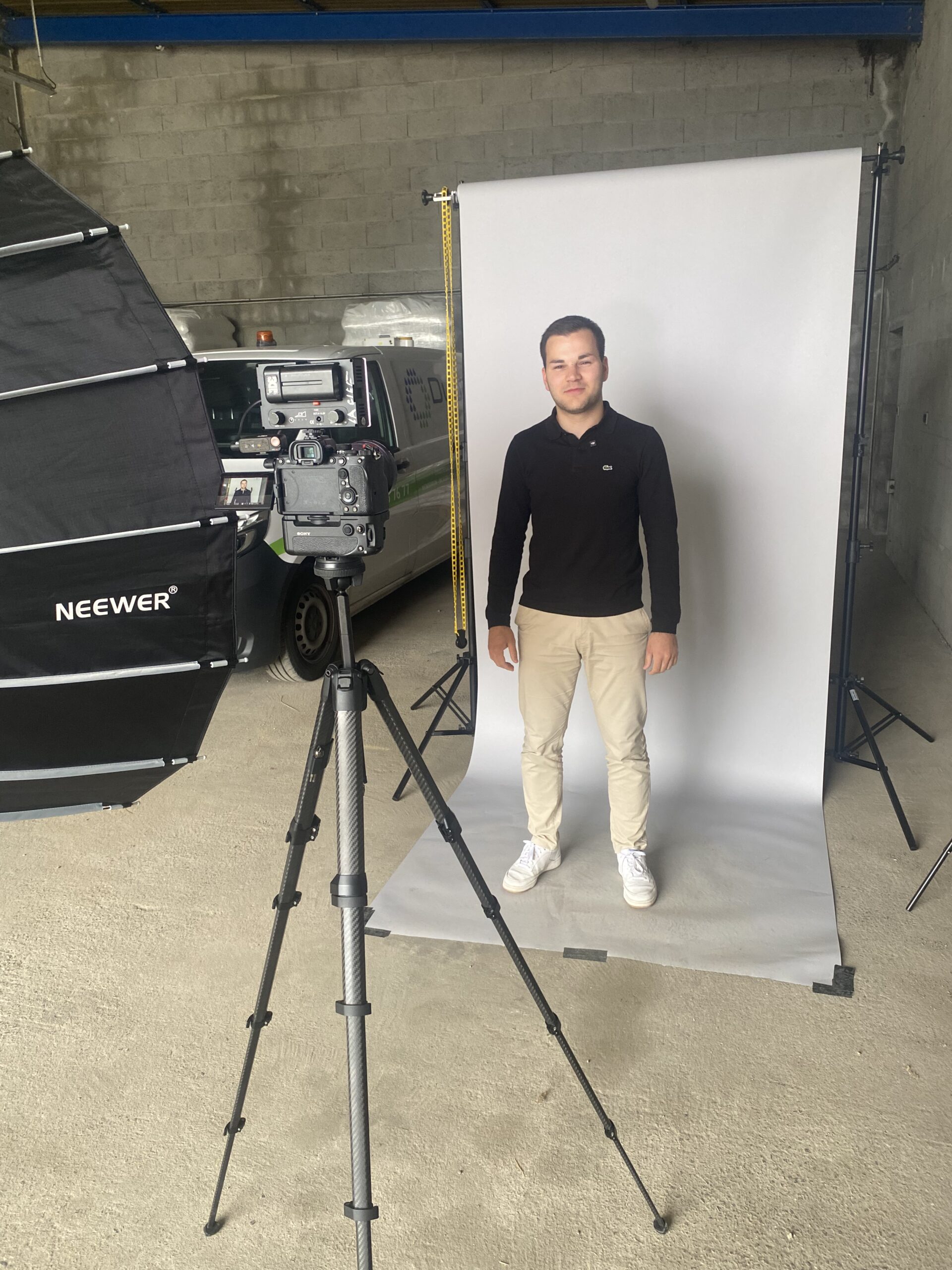 De quoi avons-nous besoin ? Simplement d’une salle de réunion vide (environ 15 à 20m² pour avoir assez de recul). Pas besoin de fenêtres ou de lumière naturelle spécifique, j’apporte mon propre éclairage pour garantir un résultat constant, qu’il fasse grand soleil ou qu’il pleuve.